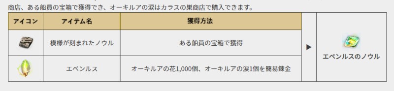 エベンルスのノウルを製作するためには、「模様が刻まれたノウル」と「エベンルス」アイテムが必要です。エベンルスを製作するためには「オーキルアの花」1,000個、「オーキルアの涙」が必要です。