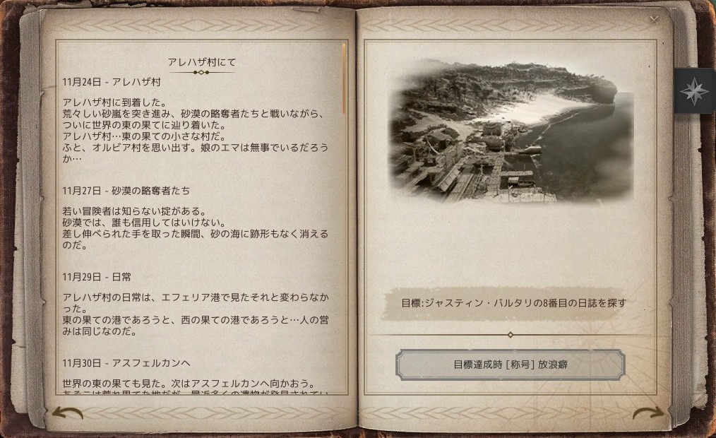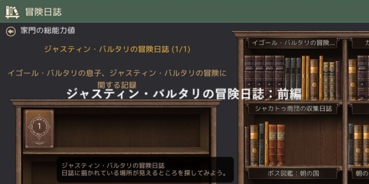 その連続依頼を進めていくと、「[冒険日誌]ジャスティン・バルタリの冒険日誌」の依頼を進めることができ、その後[メニュー(ESC)-冒険(F5)-冒険日誌本棚]でジャスティン・バルタリの冒険日誌が活性化されます。