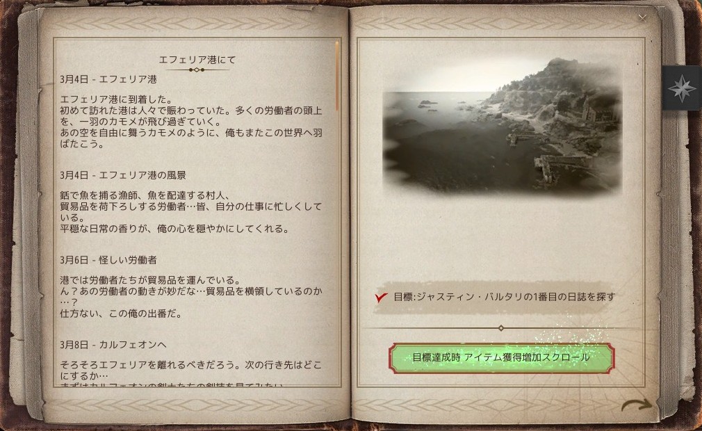 1.ジャスティン・バルタリの1番目の日誌を探す(目標達成時:アイテム獲得増加スクロール)