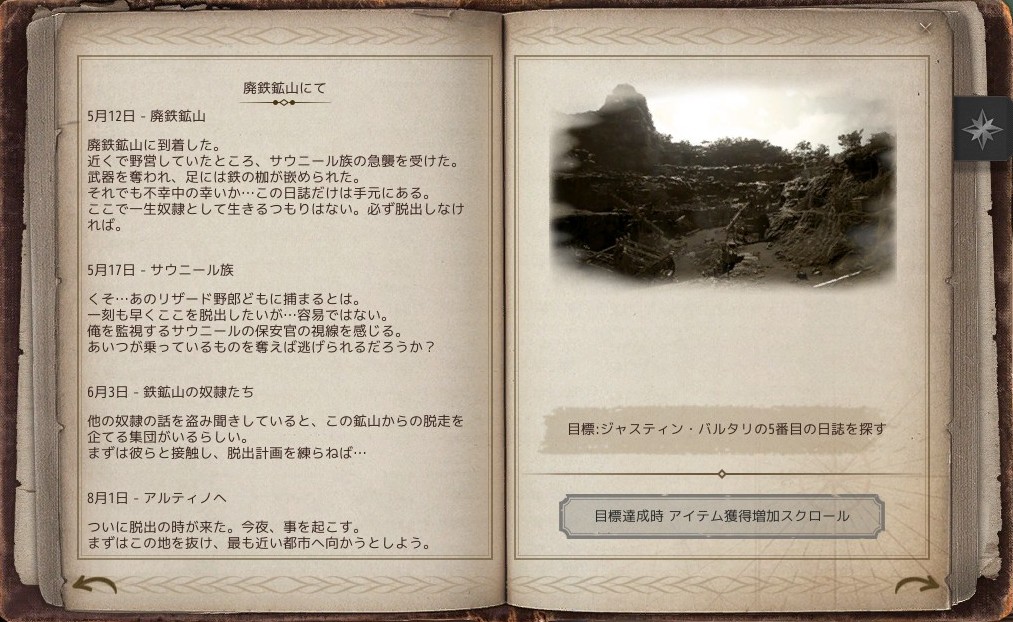 5.ジャスティン・バルタリの5番目の日誌を探す(目標達成時:アイテム獲得増加スクロール)