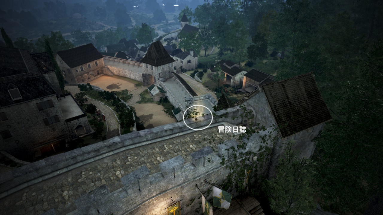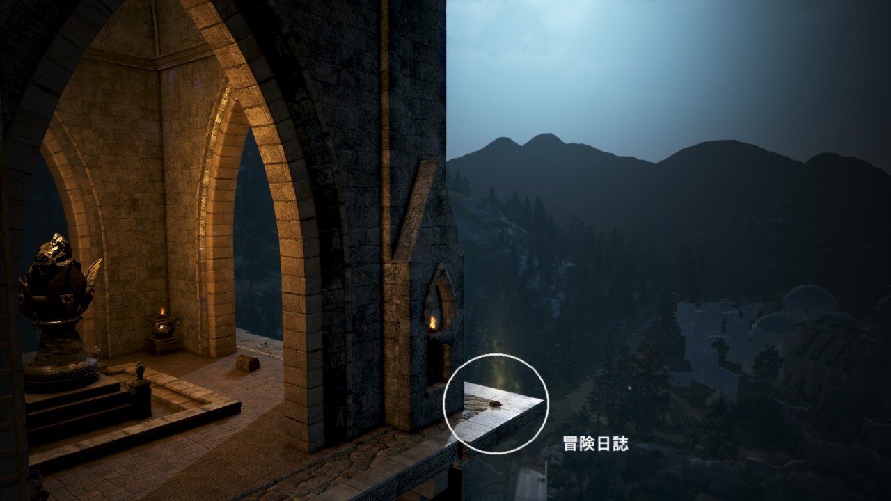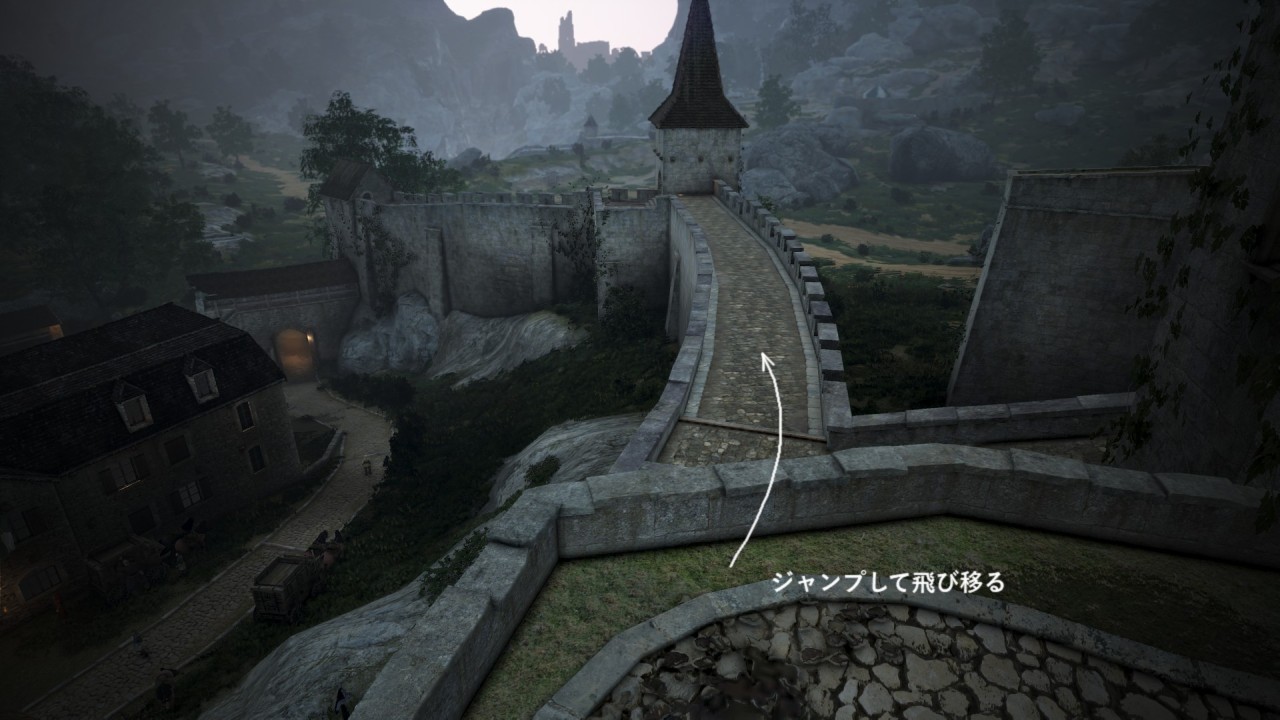 4番目の日誌は、ハイデル城の城壁にあります。行き方は令嬢「ジャレット・ドモンガット」がいる後ろの張り出し部分からジャンプして、城壁に飛び移ります。