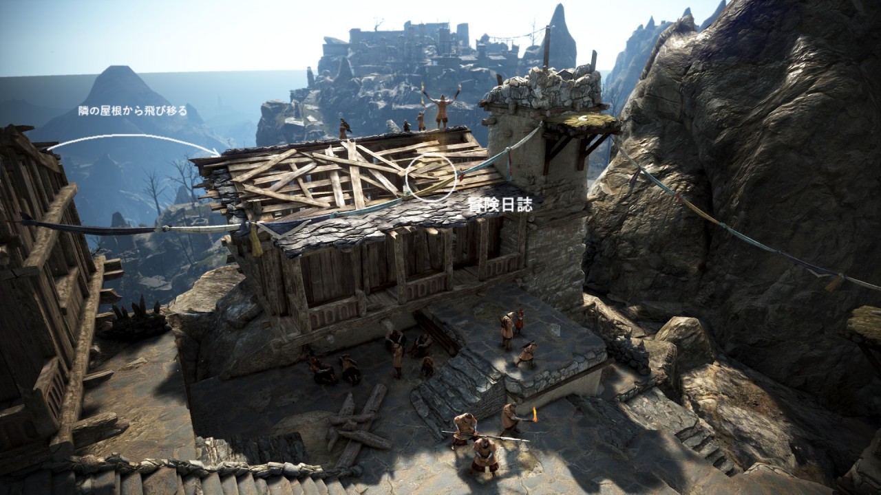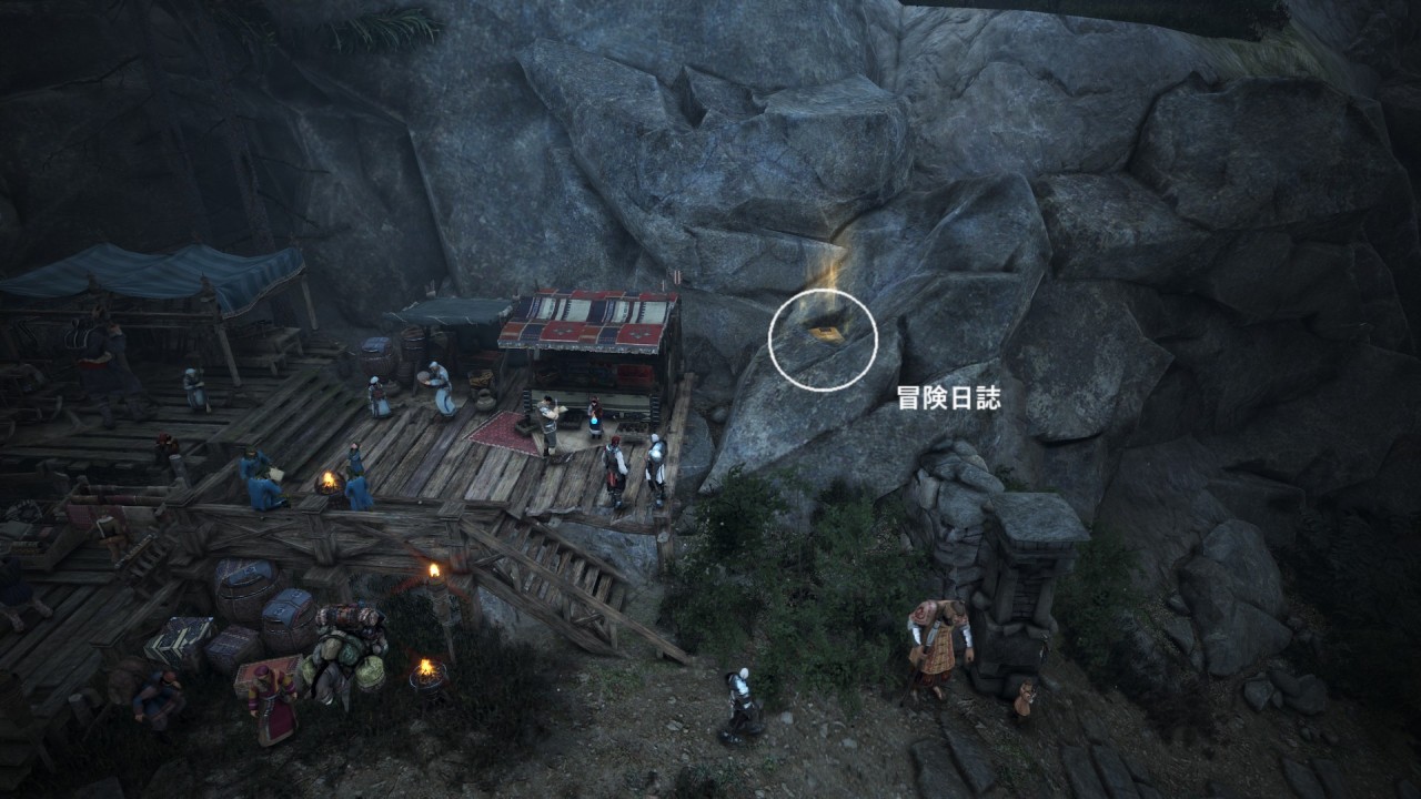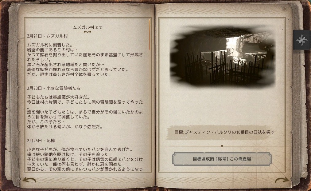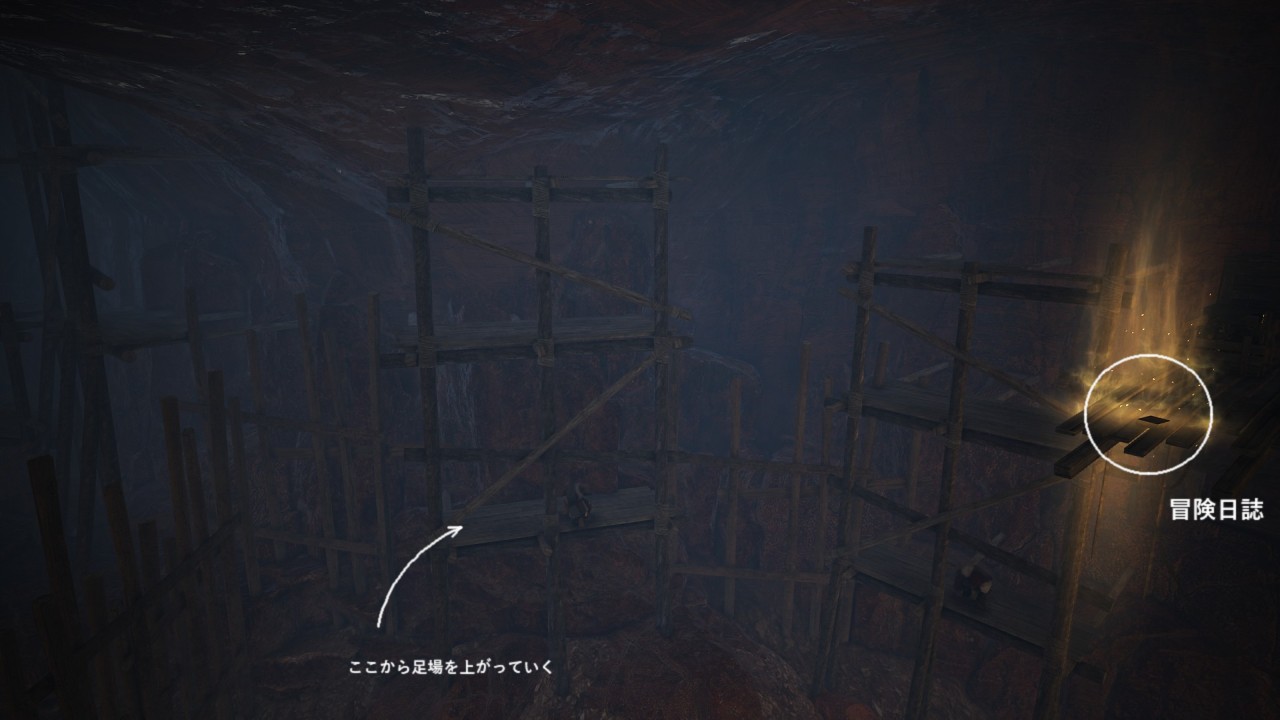 10番目の日誌は、ムズガル村の鉱山入口にある足場の高所にあり。手前の足場から上がっていく。途中で冒険日誌がある足場へ飛び移る。
