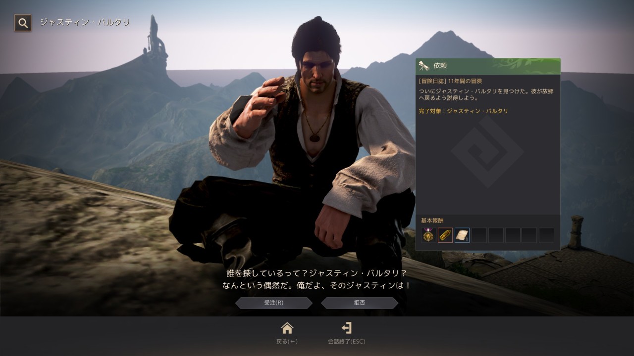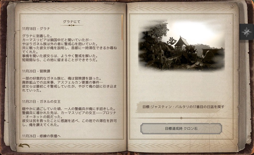 17の日誌をすべて見つけると闇の精霊からの依頼「[冒険日誌]ジャスティンはどこに?」を受諾できます。バルタラ・修練の祭壇に向かい、ジャスティンと会話すると報酬が獲得できます。