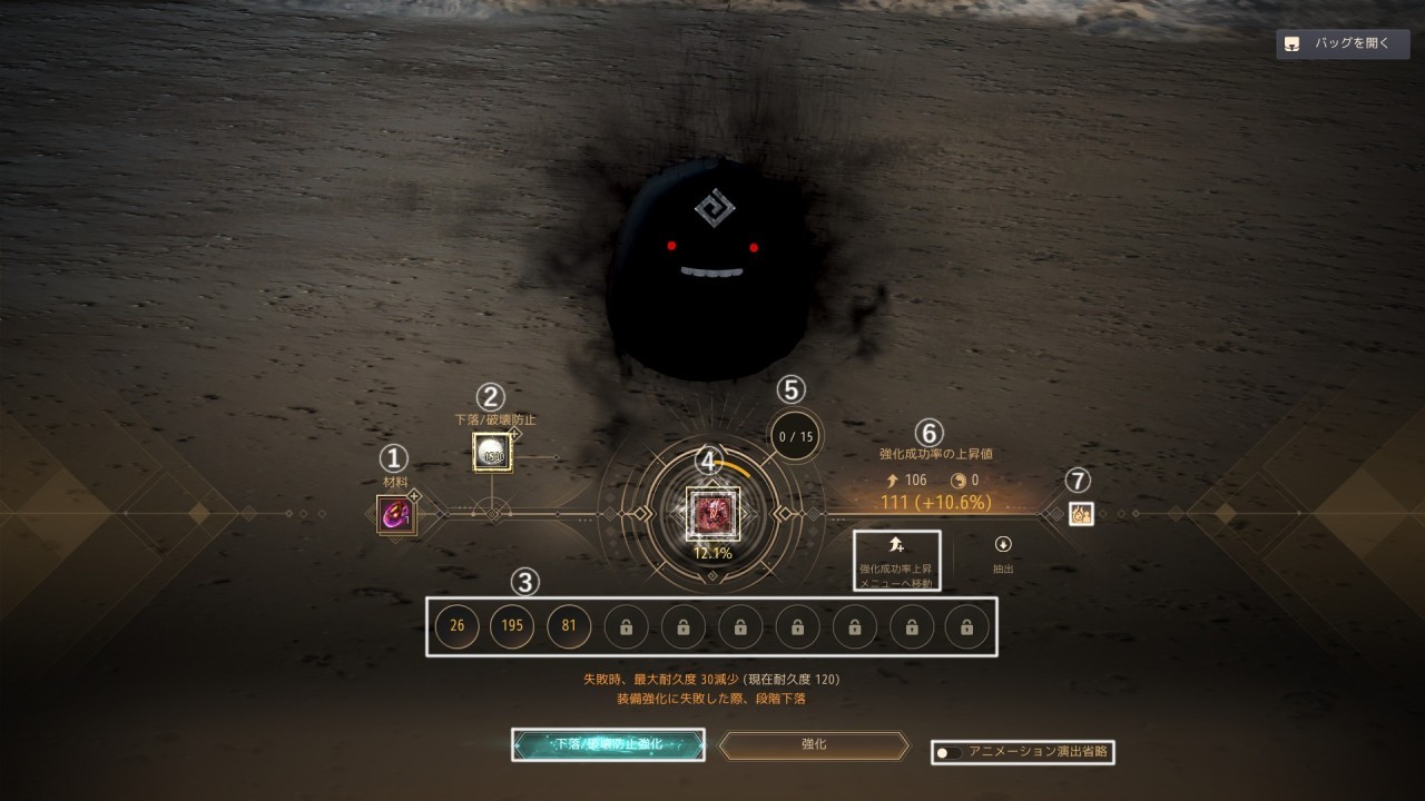 ※ 強化を進めるボタンが「下落/破壊防止強化」と「強化」に分離され、「強化」ボタンは下落防止保護材料を登録しなかった場合のみ活性化されます。