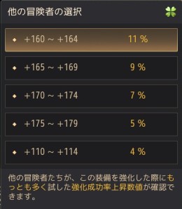 このアイコンをクリックすると、「他の冒険者の選択」画面が開きます。強化する場合の強化成功率の上昇値(スタック)選びの参考にします。