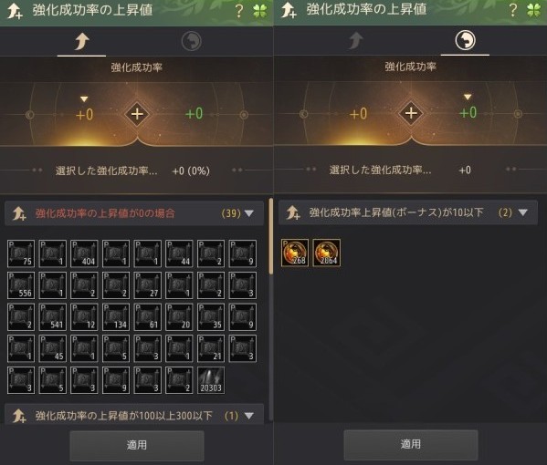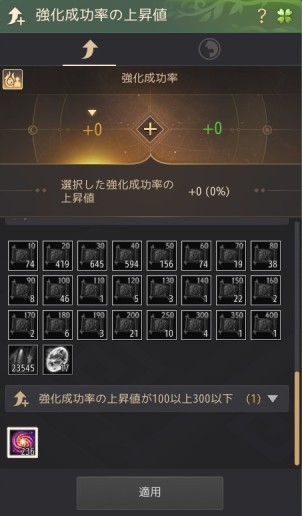 強化成功率の上昇値の下には「○○闇捕食の起源」があり、アイコンを選択して「レ」マーク状態にて「適用」をクリックすると、回数分だけ強化成功率の上昇値(スタック)が上がります。