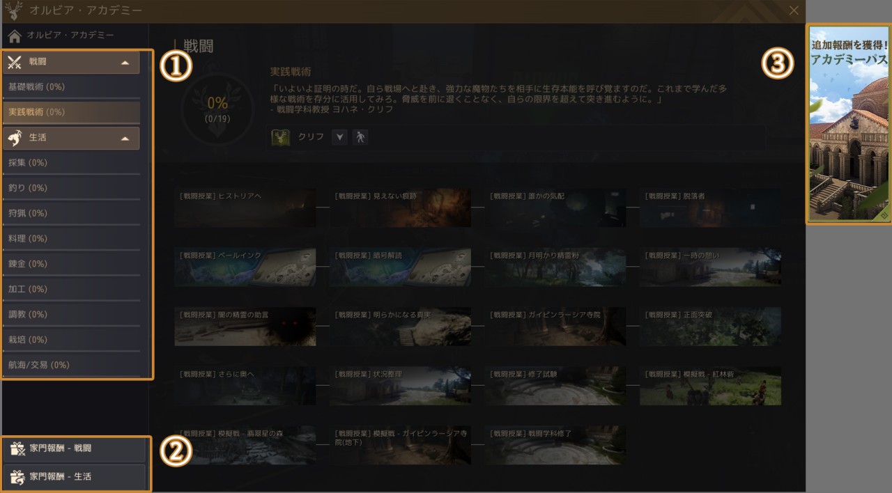 | ① 授業の全体的な進行度を確認できます。 ② 授業の進行度に応じた家門報酬を受領できます。 ③ アカデミーパスで追加の報酬を受領できます。 |