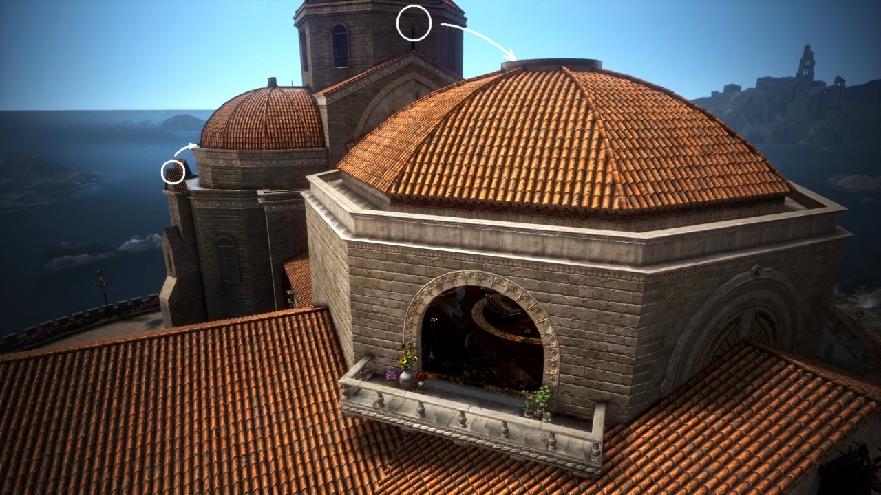 エフェクトのある屋根には直接登れないので、海側にある別棟の屋根に上って、そこから飛び移るようにすれば辿り着けます。