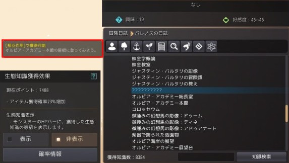 知識の「冒険日誌」→「バレノスの日誌」を開いてみると、オルビア・アカデミーで取得していない知識のヒントが「オルビア・アカデミー本館の屋根に登ってみよう」でした。