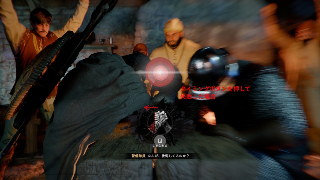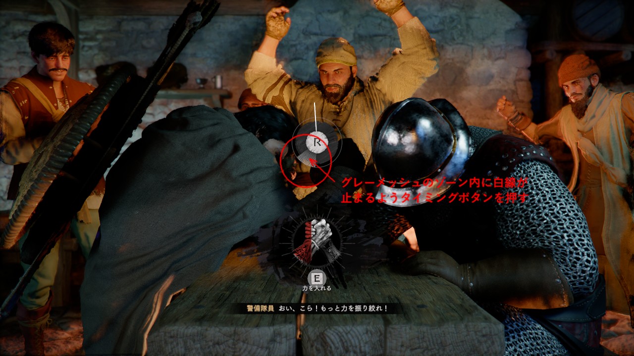 エルナンドの酒場で行う腕相撲対決を勝利するためには、アクションボタンの連打と指定されたボタンをタイミングよく押すことを、組み合わせたものです。