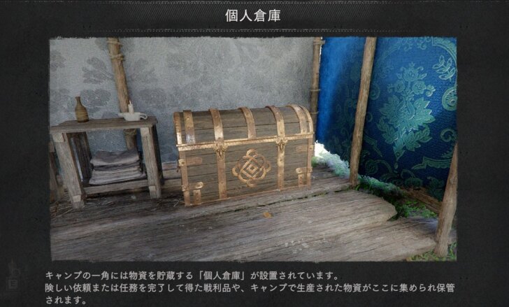 エルナンドの仮住処に設置されているテント内の箱が、個人倉庫となってます。第3章狼の丘のキャンプ設立後は、そこのテント内の箱が個人倉庫として活用できます。(仮住処のテント内の箱はなくなります)