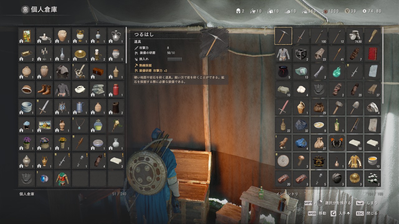 アイテムを選択してPCの場合「Space」ボタンで、インベントリ内と倉庫内のアイテムの入れ替えが可能です。「G」キーで入手順等の並べ替えも可能です。