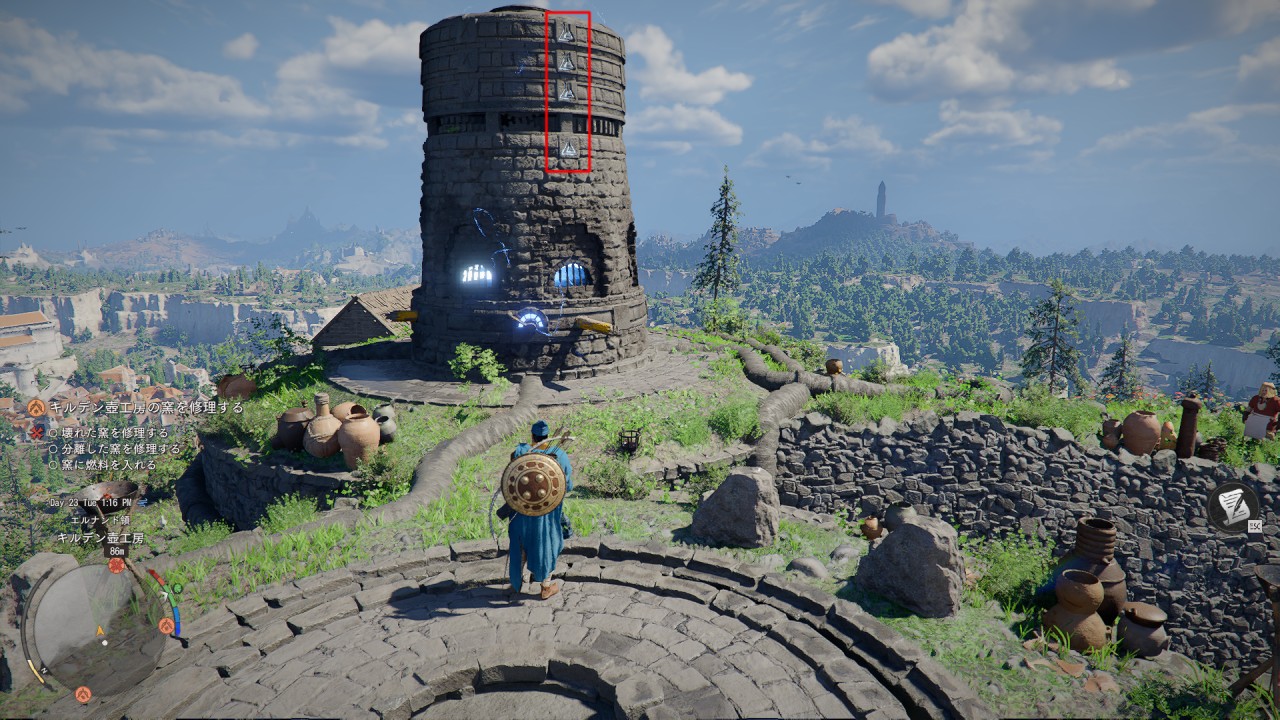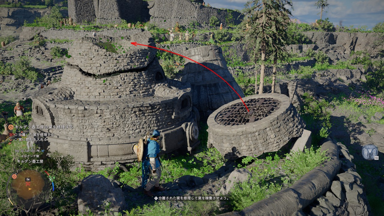分離した窯はスキルの「摂理の力」と「衝波」を使って結合させ修理します。2つ欠片を使用します。窯の傍にある丸い輪の欠片を、最初に使用します。その後に下図の欠片を、丸い輪の欠片の上に位置を合わせて置きます。