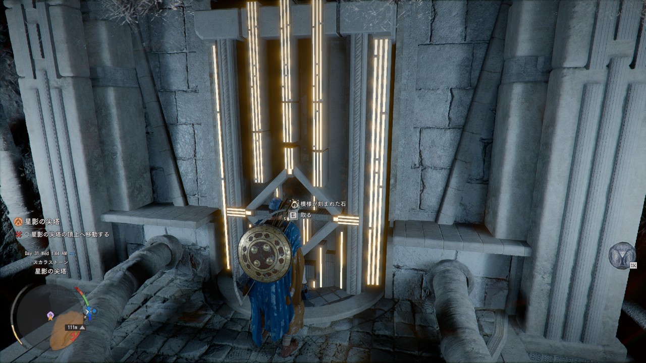 石板が回転して「模様が刻まれた石」が獲得できますので、同様に他2か所も「模様が刻まれた石」を獲得します。