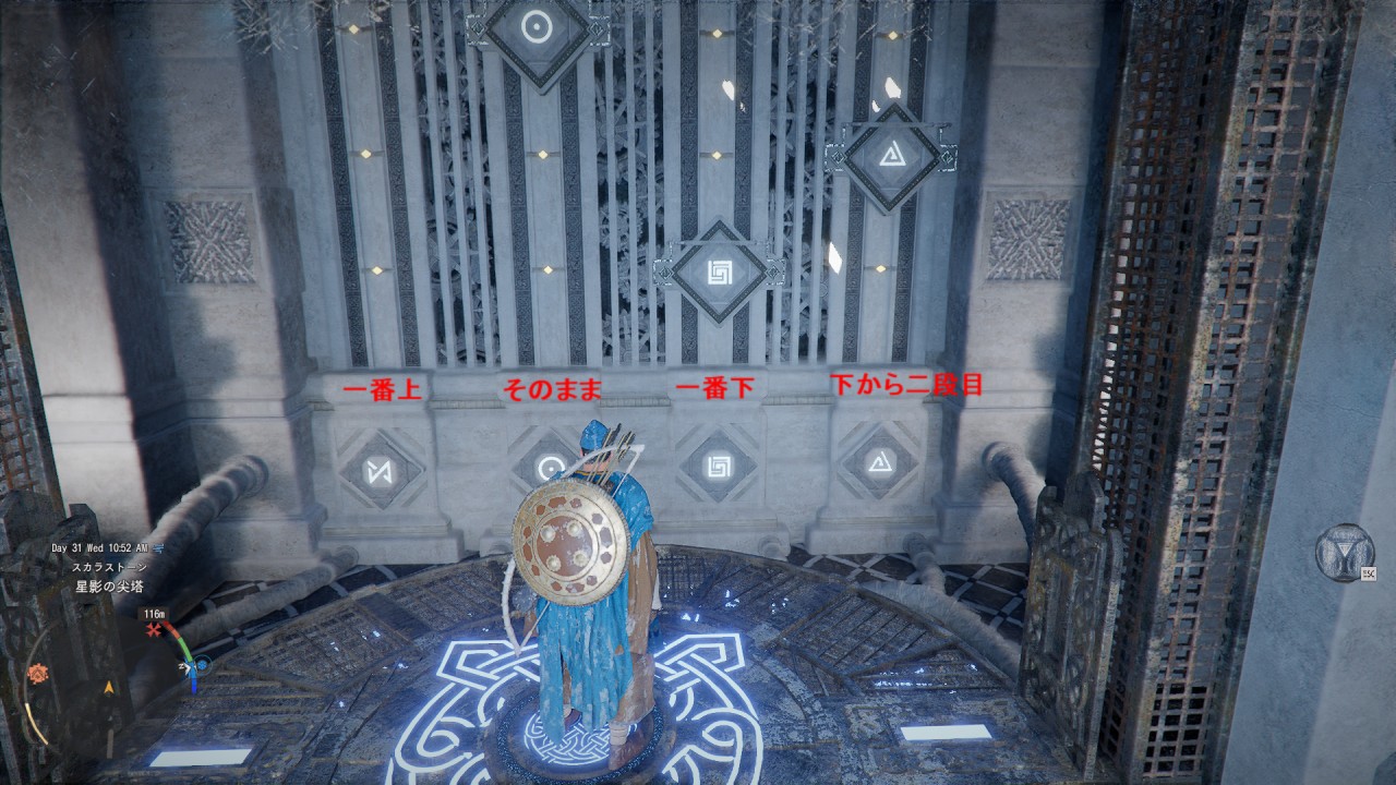 左右(両側)の壁の絵柄と比較して、同じ位置(高さ方向)に石板がくるように動かします。動かし方は石板の上側のバーにぶら下がると1段ずつ下がり、下の石板を押すと一番上まで移動します。