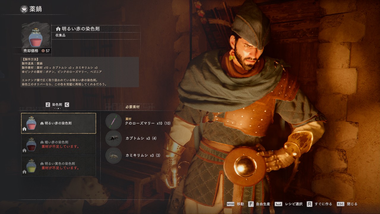 ナイラから貰った材料で「薬鍋」を使って染色剤を作ります。「薬鍋」はエルナンド内にあり、クエストマークで表示されます。材料がある「明るい赤の染色剤」を作ります。