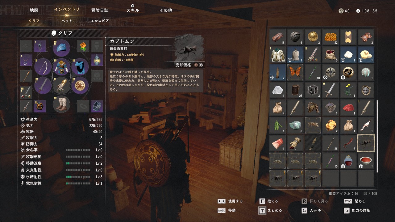 対策としては、材料のカブトムシ3匹を順に「F」キーで捨てて、「E」キーで再度確保します。カブトムシは一度に3匹捨てたら1匹になっていましたので、1匹づつ行います。(再度確保するとアイコン枠に「!」マークがつきます。