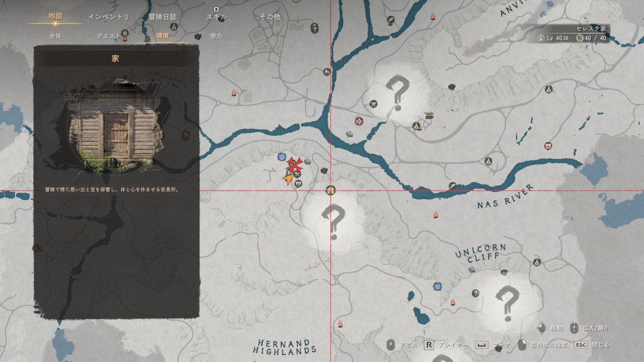 メインクエストが第3章に入り、勢力クエストの「日の出の地」クエストが現れるあたりで、家が地図に表示されます。確認の仕方は、「地図」→「環境」で狼の丘の南東にマウスを合わせると「家」と表示されます。この場合、ハウジングシステムが開放されています。