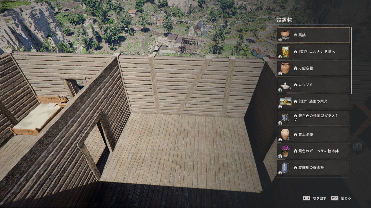 家具の位置が確定したら、配置「Space」を押します。後は「Esc」を押したまま、「やめる」を選択します。薬鍋と絵画を設置しました。