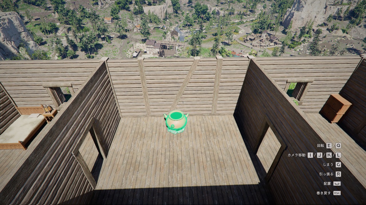薬鍋が仮設置されると下図のような状態となりますので、回転「E」/「Q」、カメラ移動「I」/「J」/「K」/「L」、しまう「G」、引っ張る「R」、配置「Space」、巻き戻す「Esc」各キーを使って設置したい位置に動かします。(引っ張るは現位置からマウスで動くスポットを設置したい位置まで移動して「R」を押します)