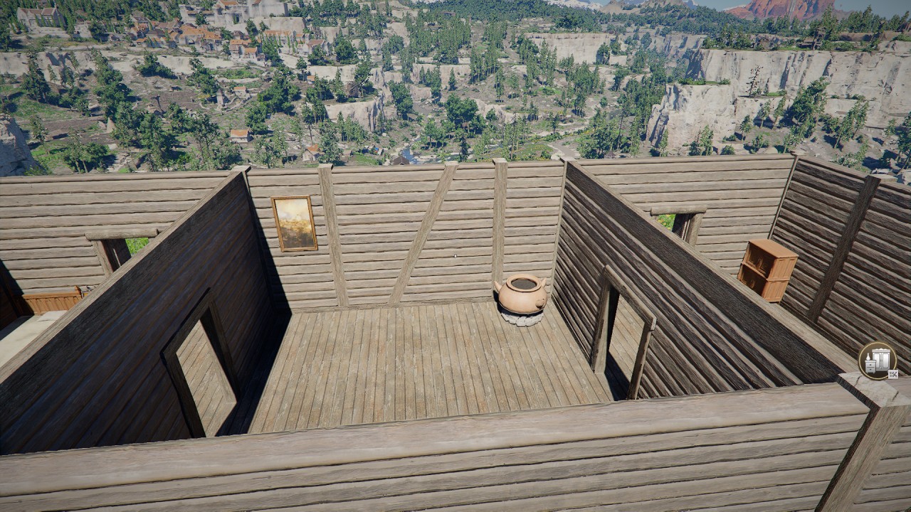 家に入ると、PCの場合は家アイコン(「Esc」キー動作)が表示されます。「Esc」を2回押すと、インベントリ内にある設置可能な物の一覧が右側に表示されます。例として、一番上の「薬鍋」を取り出します。(※ 薬鍋は購入品です)