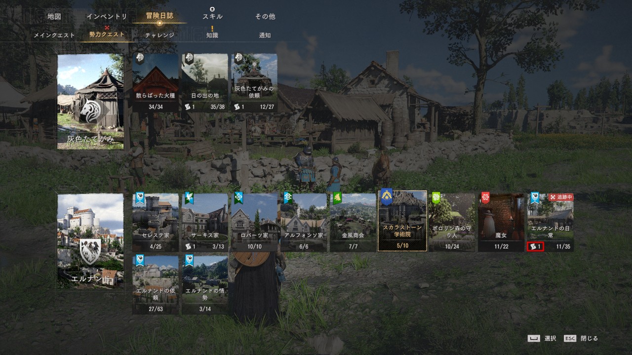 ※ 「工房の新技術」クエストがエルナンドの日常に発生してない場合は、下記勢力クエスト一覧を参考にしてください。バーデン様からの贈り物という文言から、サーキス家のクエストが影響している可能性が大きいです。赤枠の未完了クエストが、「工房の新技術」クエストです。