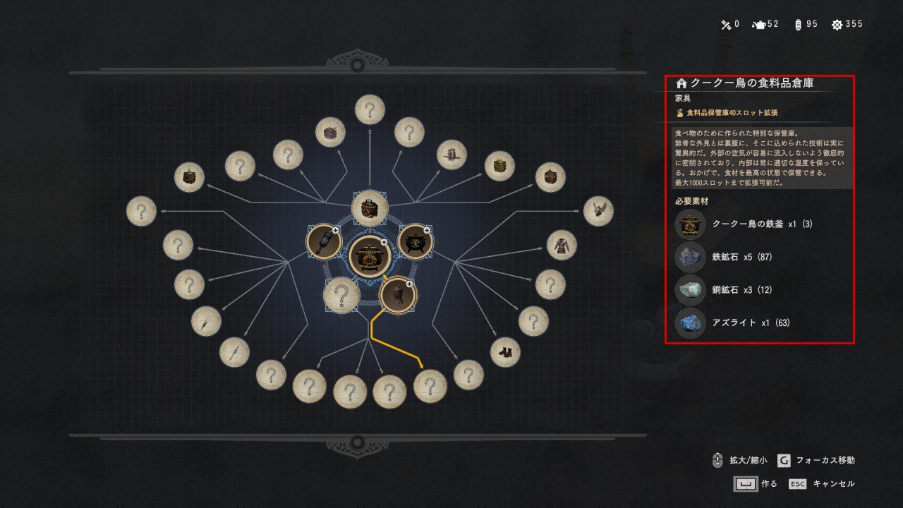 完成したクークー鳥の食料品倉庫を職人に見せると、クークー鳥の強化された食料品倉庫の設計図が獲得できるので、クークー鳥の強化された食料品倉庫(330スロット拡張)が制作可能となります。