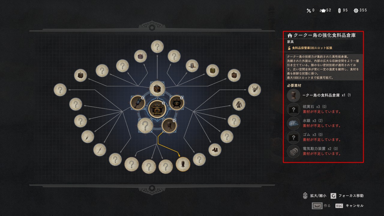 材料はクークー鳥の食料品倉庫×1、硫黄石×3、水銀×3、ゴム×3、電気動力装置×2です。