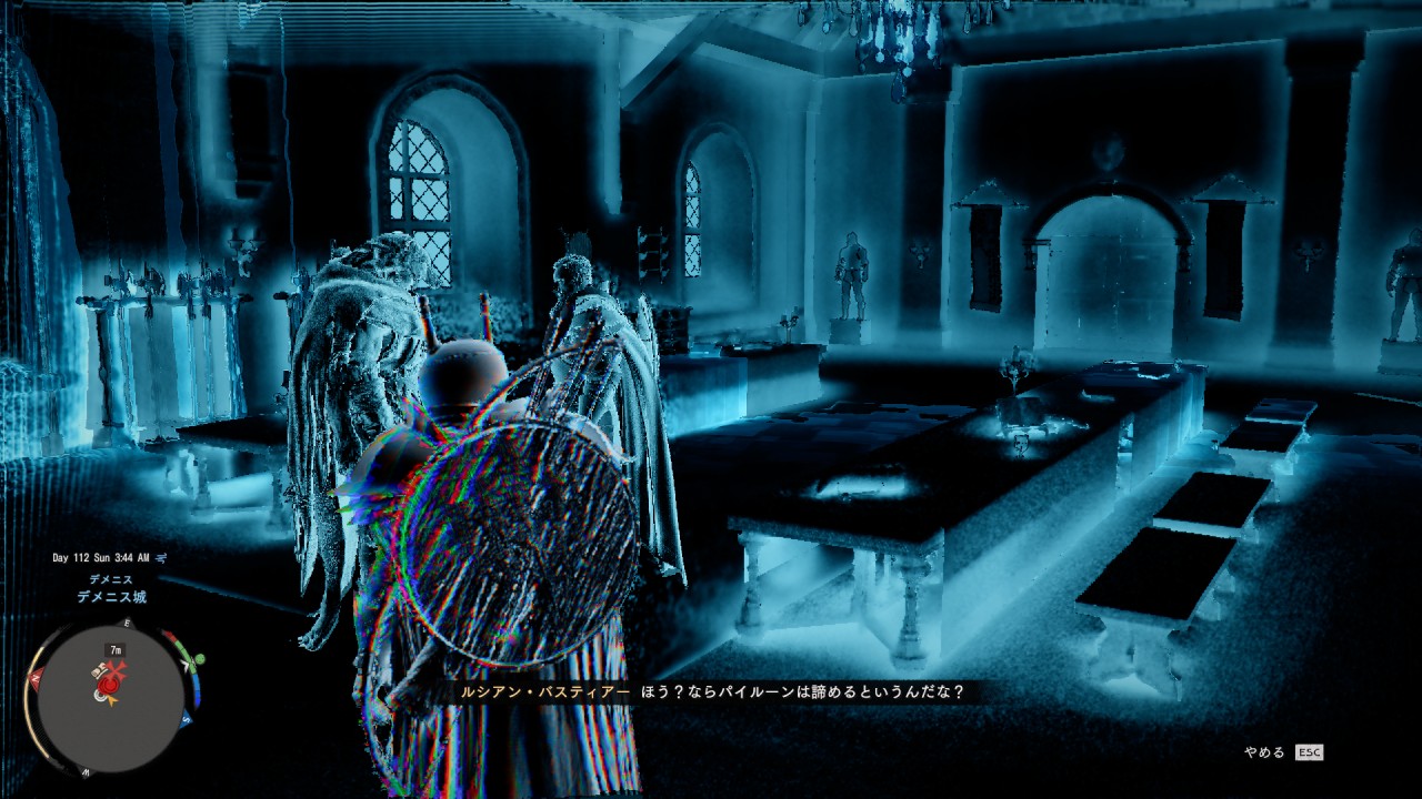 「血の戴冠式」クエストでは、記憶の断片を再生したまま移動する必要があります。(通常通りに再生を止めるとクエストが進みません)ミュルディンが部屋をでたら、部屋を出ていくルシアン・バスティアーの後を追って移動します。1階の多くの貴族が集まっている謁見室まで、ついて行きます。