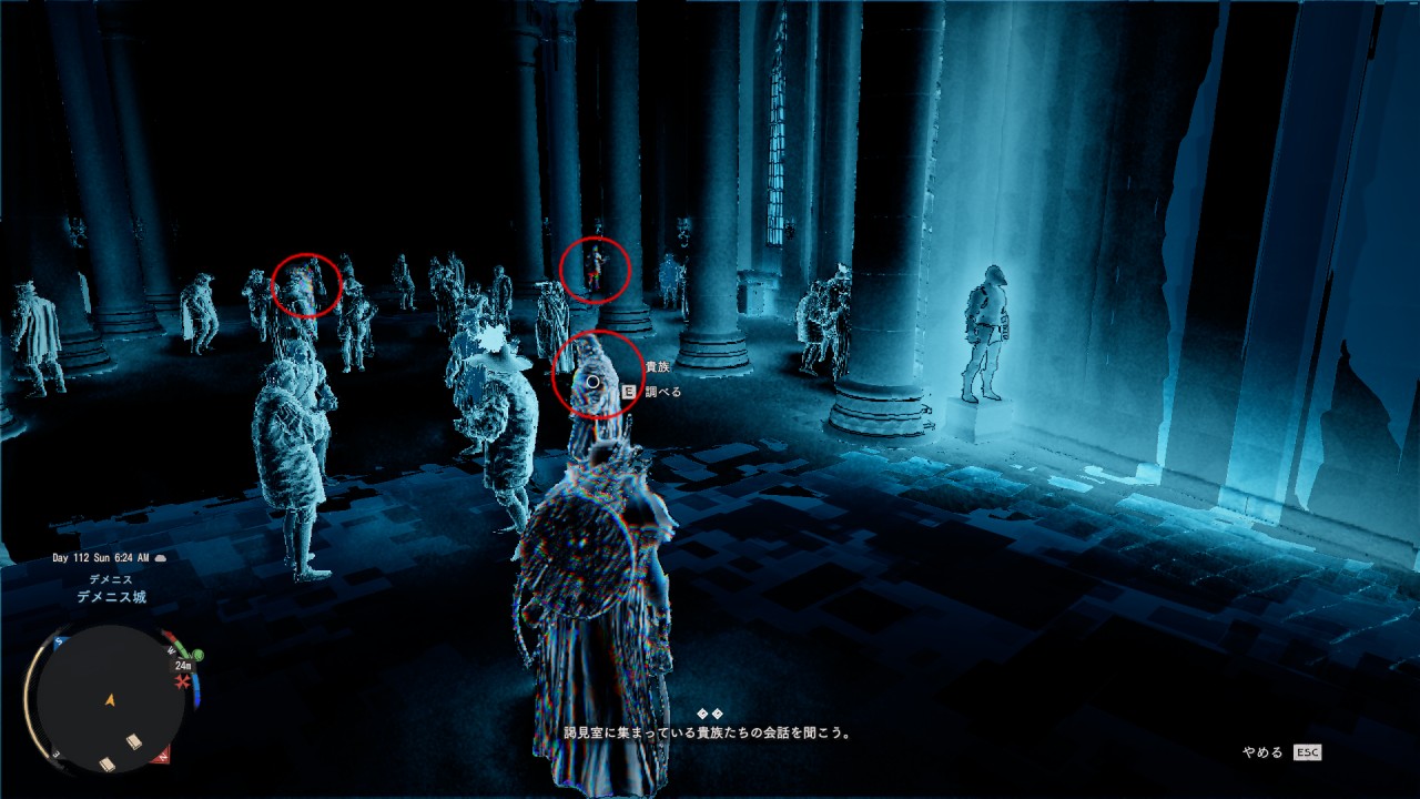 謁見室に移動したら、記憶を再生している状態で貴族を3人調べます。赤丸の貴族が調べる対象です。