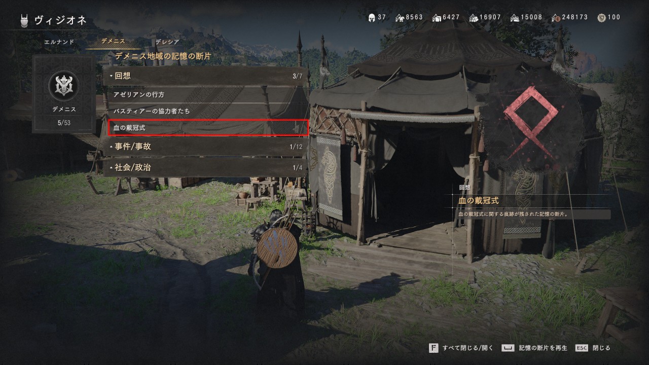 ※ 記憶の断片を途中でやめてしまった場合は、再度かつての執務室まで行きインベントリからヴィジオネを使い、上部タブを「デメニス」に切替えて「回想-血の戴冠式」を選択します。これで再度、記憶の断片が見られます。