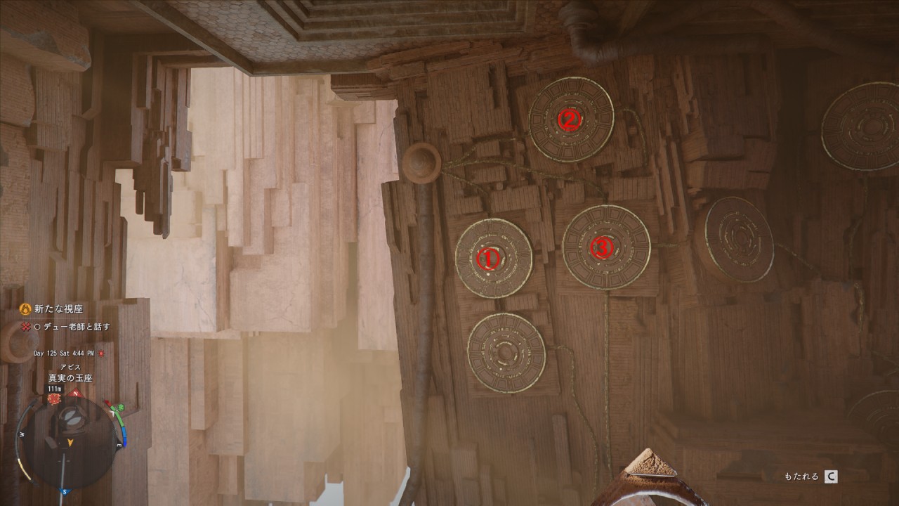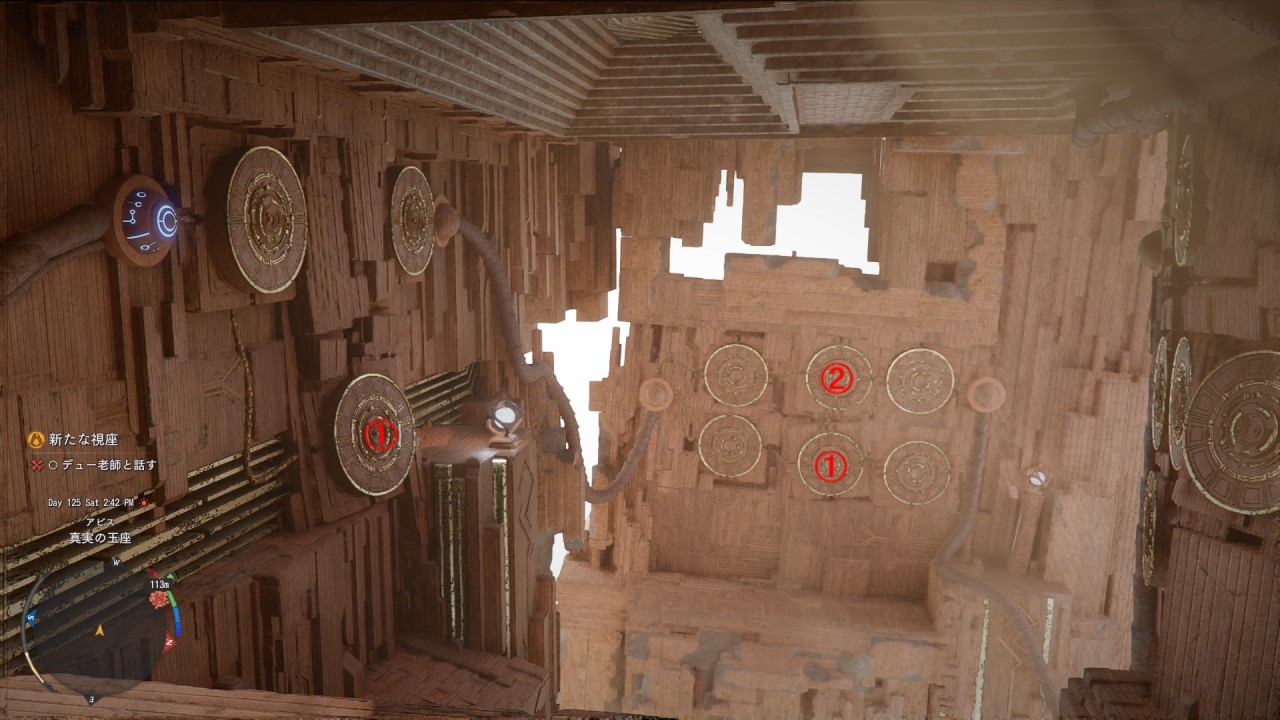 デュー老師がいる目的地の前に、上昇気流の装置があります。この装置を動くようにするクエストです。付近に四角い切り欠き穴がありますので、そこから下に降ります。下に降りたら、向かって左側および正面の石板プレートを下図の順番で掌波を使って押して、通電させます。石板プレートがすべて電気が通っている状態(青白く光る)になればOKです。