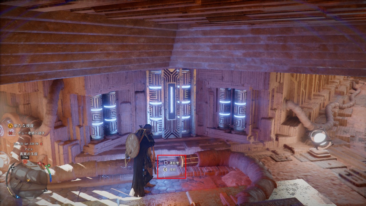 石板プレートがすべて通電する(青白く光る)ようになったら、最後に降りた場所のすぐ横にあった連結管を繋げます。これで外の上昇気流の装置が動作します。